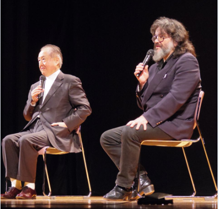 (公演後のアフタートーク、スパイスとユーモアを交えて話す秋辺氏(右)と下館主宰。