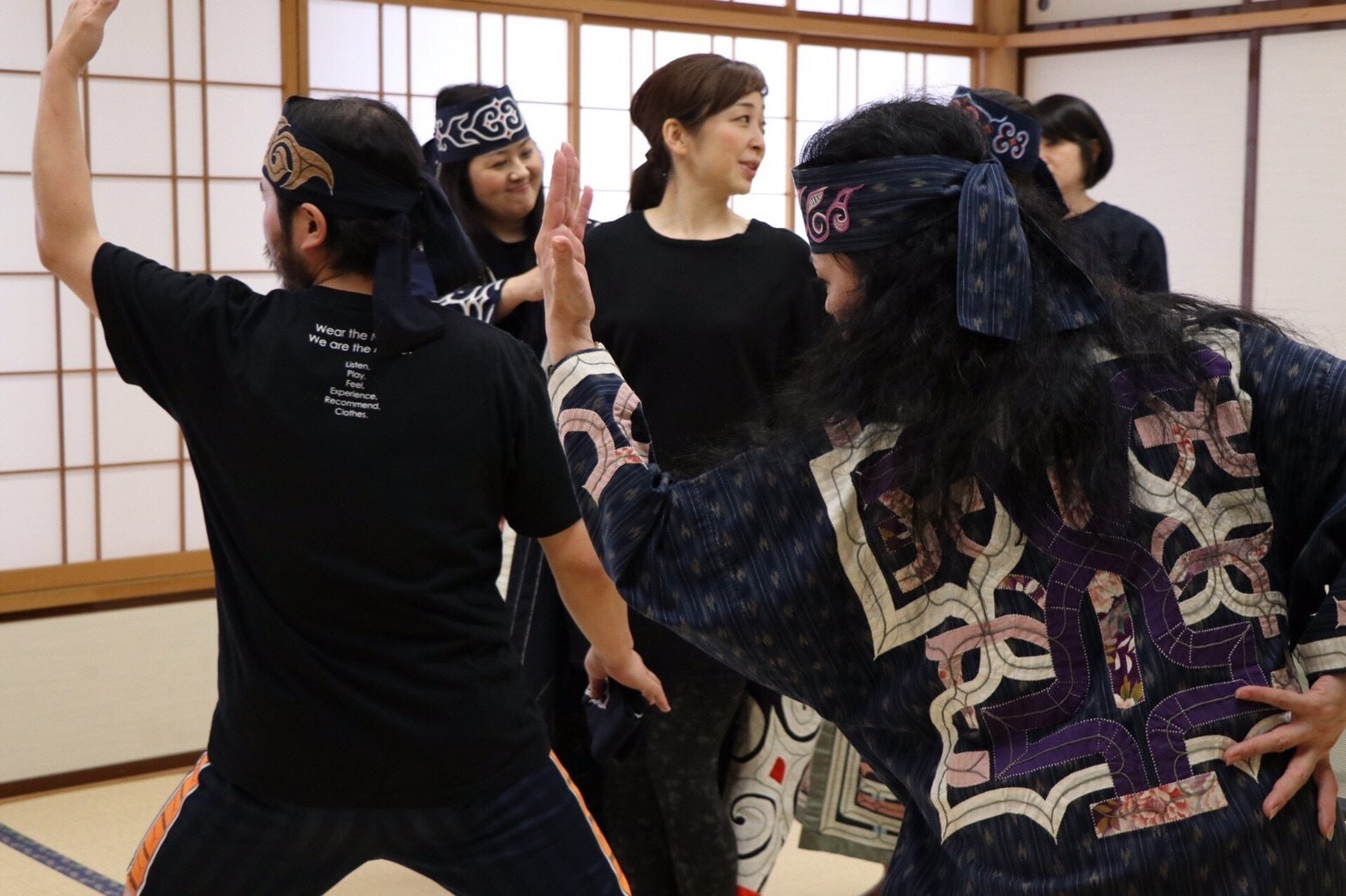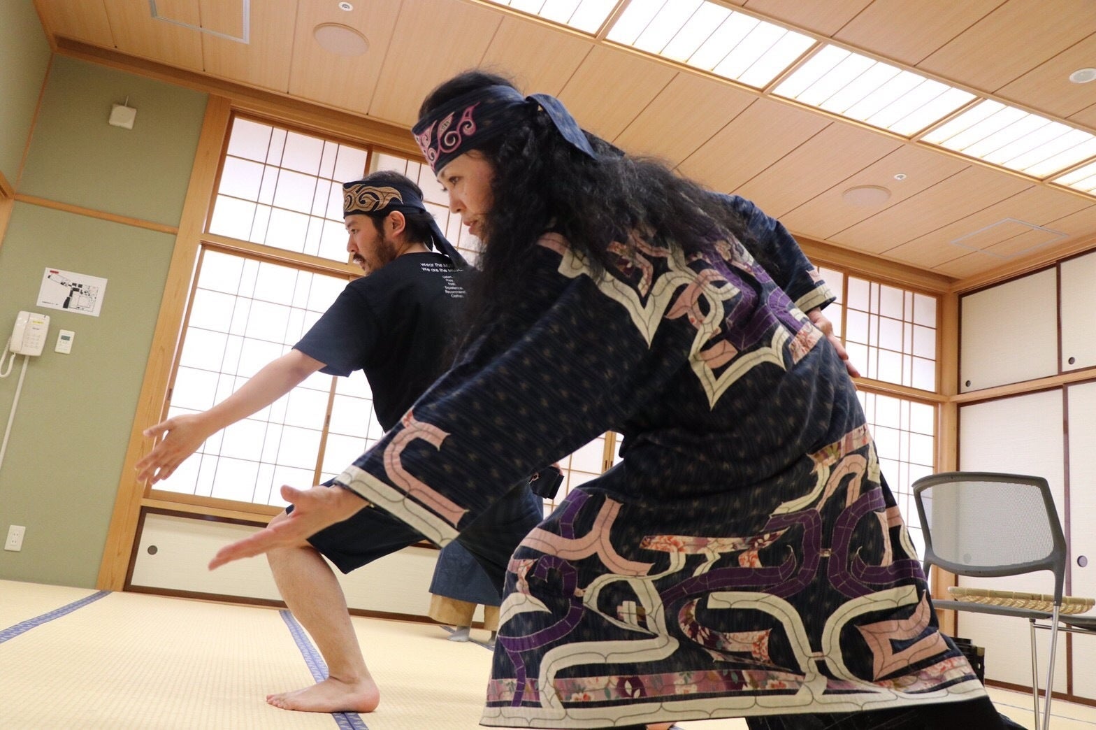 6月8~9日はピリカップの4名が仙台に1泊2日でやって来て、ロンドン公演参加者全員での合同稽古を実施しました。ロンドン版では昨年と比べてピリカップの出番は増え、仙台の役者たちとの絡みも複雑になっています。まずはお互い準備してきたものを見せ合って、組み合わせて、少しずつ調整して…という作業を積み重ねていきました。演技パートは主にシェイクスピア・カンパニーの東北弁の役者たちが担い、随所でピリカップのアイヌ語の唄が響くという構成で、言葉の意味を超えてロンドンでも楽しんでもらえる工夫を盛り込んでいます。