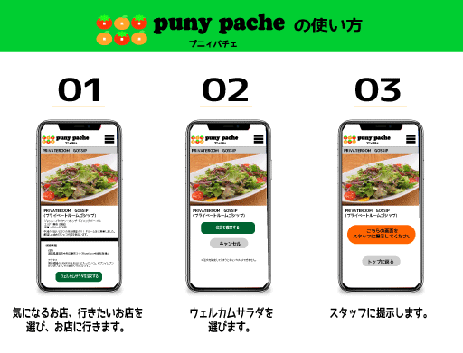 ①プニィパチェ会員になり専用のwebサイトにて行きたいお店、サラダを食べたいお店を選びます。