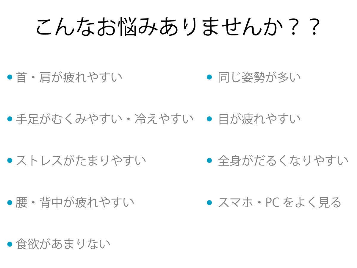 肩こり、首コリ、頭痛、目の疲れ、腰痛、背中の辛さ、倦怠感(ダルさ)などの体の不調、病院で検査したが原因不明な不調