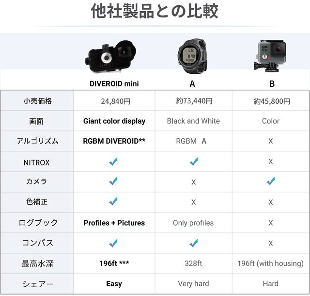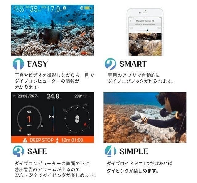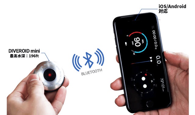 ダイブロイドミニ(DIVEROID mini)は、スマホとのBluetooth接続でスキューバダイビングにかかせないダイブコンピューター、コンパス、ログブックからカメラやビデオ機能付きのAll-In-One(オールインワン)ダイブコンピュータです。