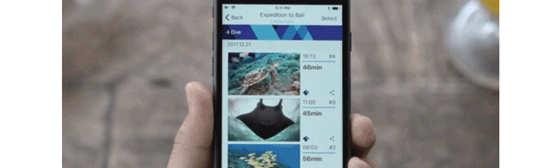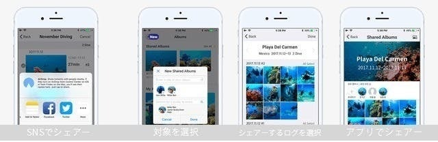 水中撮影時に写真とダイビングのログ情報を記録し、ダイビングが終わった時に自動的に自分のダイビングログブックを作成します。自分のログを見てダイビング方法を把握し、一緒にダイビングしたバディたちを招待しシェアアルバムを作ることもできます。
