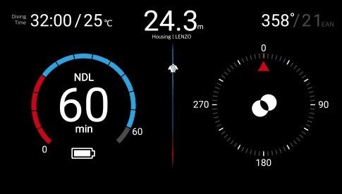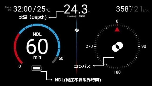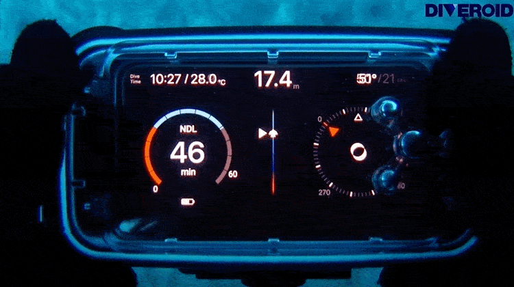NDL(減圧不要限界時間)、水深、温度及 びコンパスの表示をスマホのカラフルな画面で一目で分かるようにダイビング関する情報を表示してくれます。