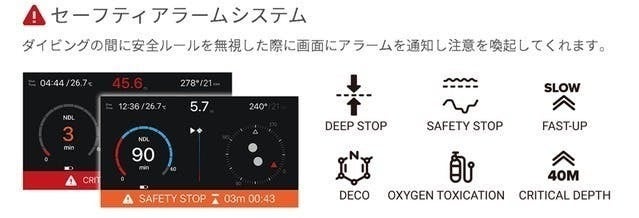 また振動やアラームで警告が表示され、より安全・安心にダイビングできます。