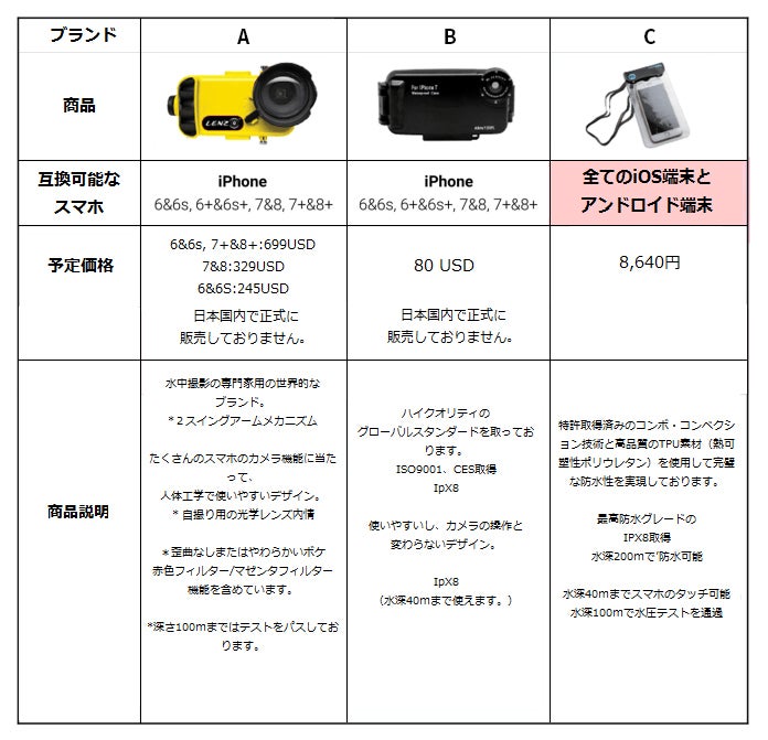 ****DIVEROID miniとの互換性のいい防水ハウジングの情報は下記の表をご覧ください。
