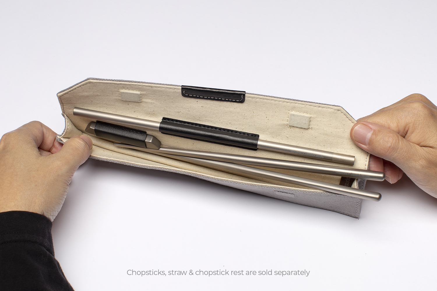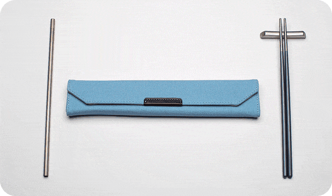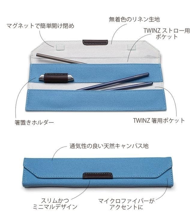 私たちのTWINZ(ツインズ)チタン製箸には、専用のデラックスポーチが用意されており、ストローと箸置きを収納できるようになっています。