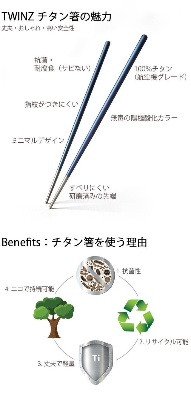 1. チタンが持つ適性 - チタンは、天然の抗菌性を有することが知られています。 また、非多孔質および非粘着性という性質のおかげで、割り箸のように内部に何かがしみ込むことはなく、掃除も簡単です。