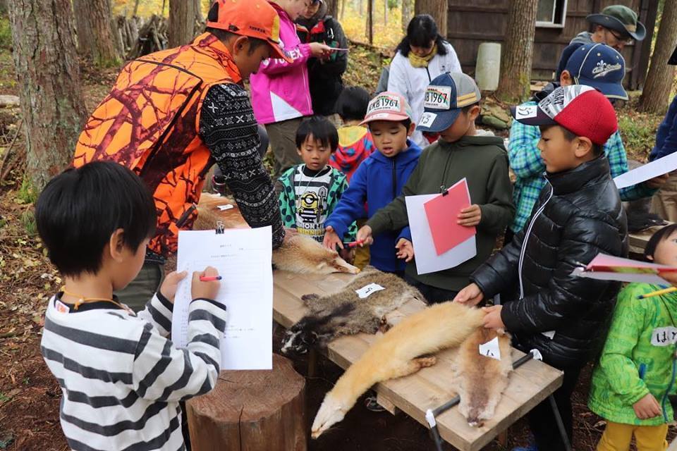 オリエンテーションからはじまり、高山で捕れる野生動物の説明、毛皮判別、獣道散策、アクセサリー作りを行った。 写真は3男 奨