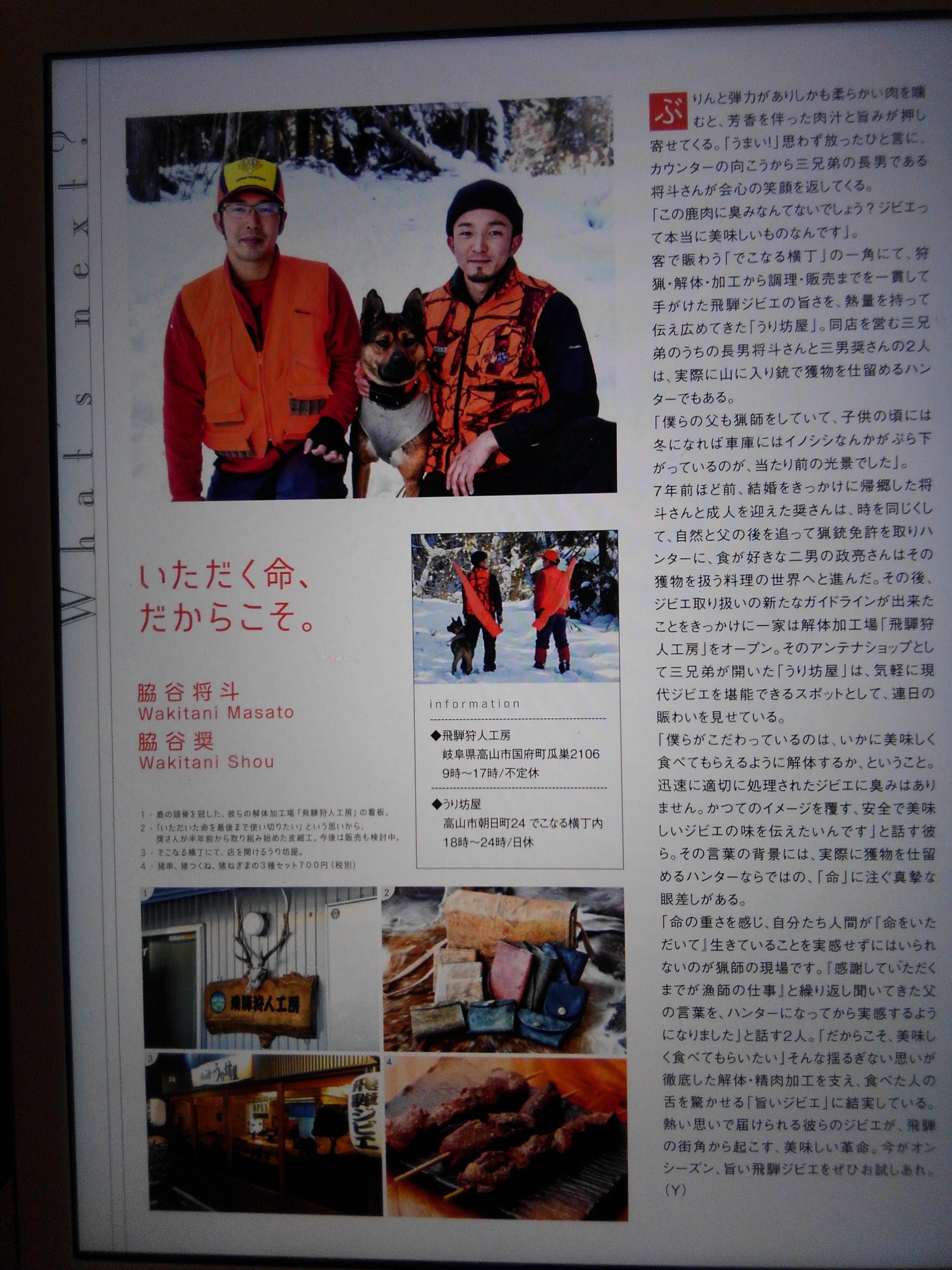 まず猟師がカウンターで狩猟について語りながら料理を出す、ジビエ専門店があっても良いのではないか、と思い立ち、高山市内の『山の幸うり坊屋』を開店し、二年間店長を務めました。