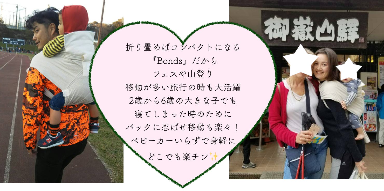 子どもの体重が分散されることにより、肩や腰の負担が少なくなくなり、これまで整体通いをしていたママが、Bondsを2ヶ月試しているうちに、気づけば整体に行かなくなったと感謝のお声を頂いております。