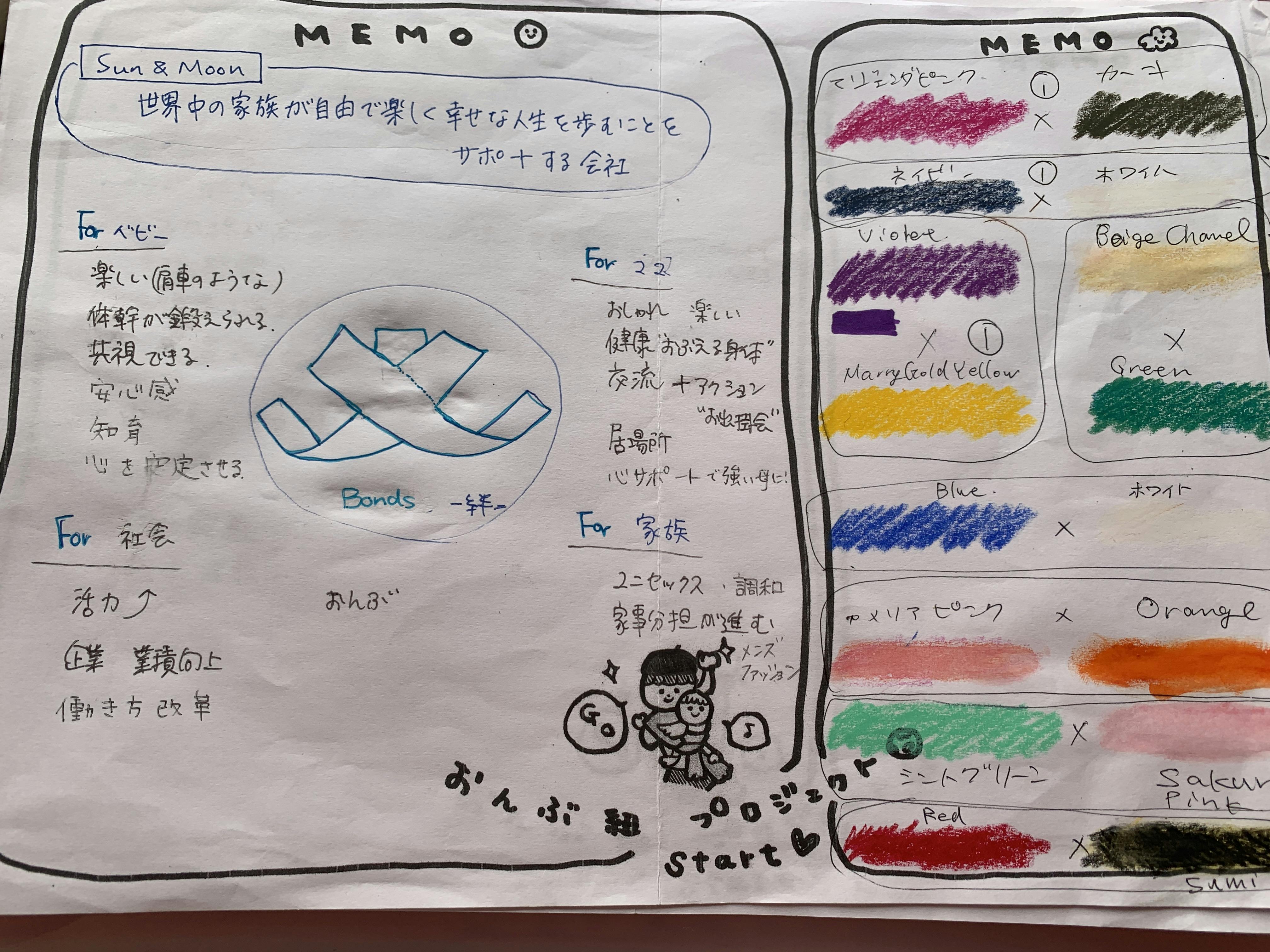 このプロジェクトは、我が子ができた事がきっかけで、友人があるおんぶ紐を貸してくれたことが全ての始まりでした。 そのおんぶ紐はおっぱいより下に布がくることがなく乳腺が痛い、と感じることもなく胸や肩が痛くなる心配もなく、見た目がスッキリ且つ機能的で衝撃的だったのです。