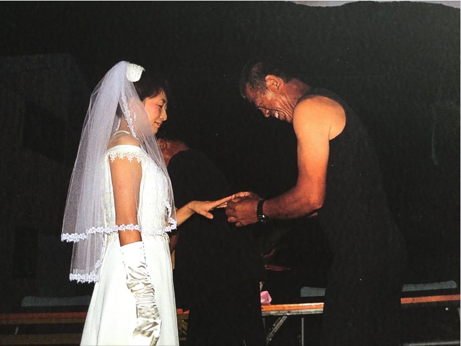 結婚式は、仲間の手作り。建設途中のカフェの前で。