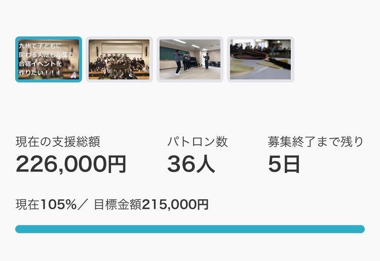 2019/08/16 08:30本日、目標金額215000円を達成いたしました!!支援してくださったパトロンの皆様方、SNSなどで私たちの活動を広めてくださった方々、並びに何らかの形で私たちを応援してくださったすべての皆様、本当に本当にありがとうございました、、、スタッフそれぞれ初めてのクラウドファンディングで戸惑いながらも、少しでも人に真摯に伝えるために本気で取り組もう...そう思っていました。その結果、これだけ多くの方が私たちの思いを汲みとって応援してくださいました。本当に嬉しく、感謝してもしきれません。さて、ここまで皆さんに支援していただいた資金ですが、ー講師様への謝礼金・交通費 ¥100000ー会場費(備品輸送など含む)¥40000ー広報費 ¥20000ー来年度以降フェスタを継続するための資金(プレイべントの会場費など)¥20000ーリターン送料等 ¥2500ークラウドファンディング手数料 ¥32500に利用させていただきます!皆さんからこれだけ支援していただいた以上、イベントの成功という形で恩返しができるように今まで以上に頑張っていきたいと思います!!また、目標金額は達成しましたがあと5日ほど期間が残っています。そこでここからの支援金は少しでも参加者の参加費を安く抑えるための費用に充てさせ頂きたいと思います!!引き続き応援の程よろしくお願いいたします!!さらにもう一つ重大ニュースです!!本イベント『ALL教育フェスタ2019学びのパレット ~白いキャンバス何描く?~』がついにリリースされました!!参加希望の方や気になる方はぜひぜひ下記のイベントページをのぞいてみてください!!https://kyouikufesta2019ky.wixsite.com/mypageではでは、この度は誠にありがとうございました!! もっと見る