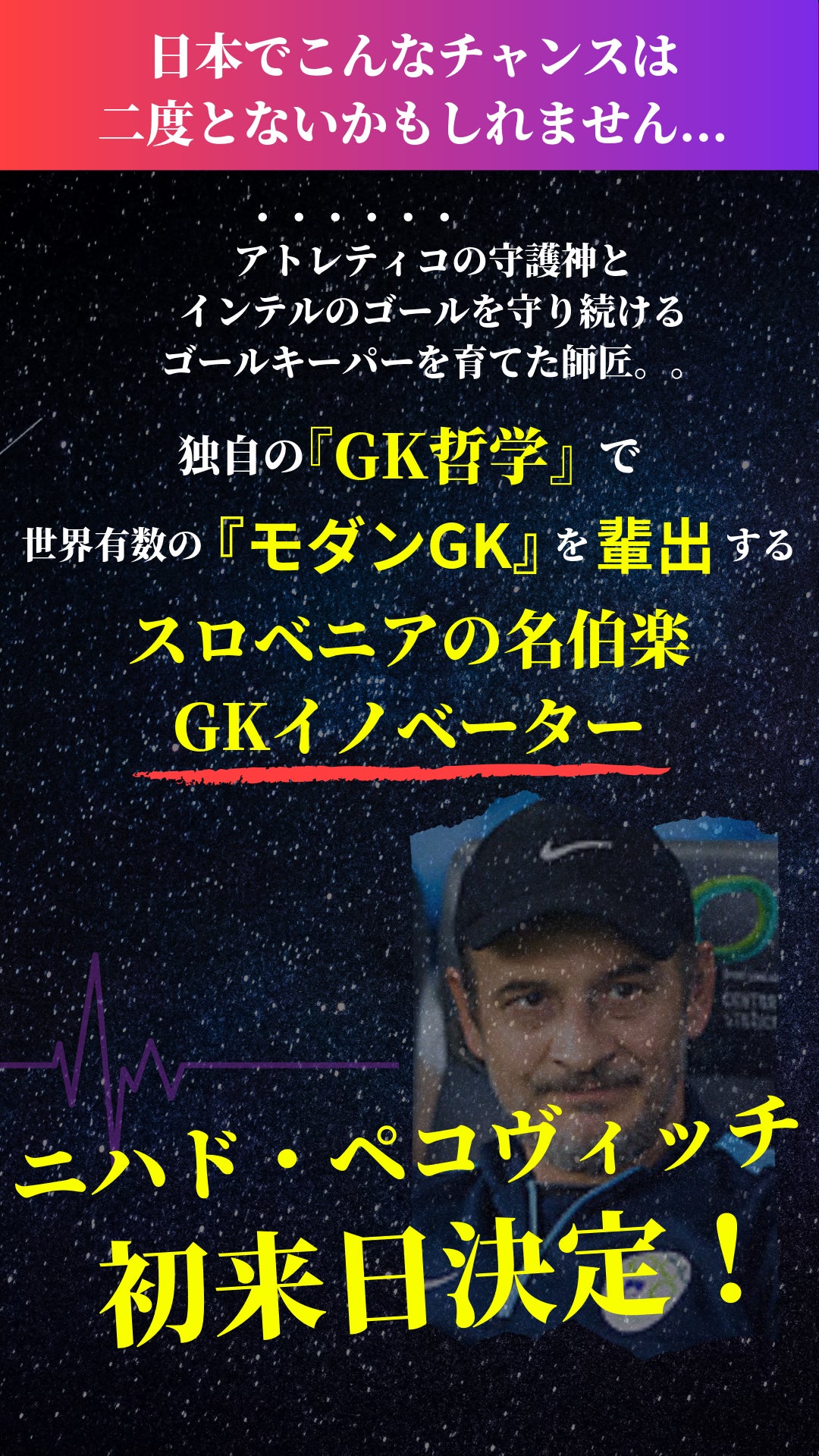 GKという特殊なポジションですが 今回、来日する「ニハド・ペイコヴィッチ」が持っている GK理論の核となる”哲学”の部分が日本の土台になれば 日本のゴールキーパー界 いや、日本サッカー界が大きく変わると信じています。