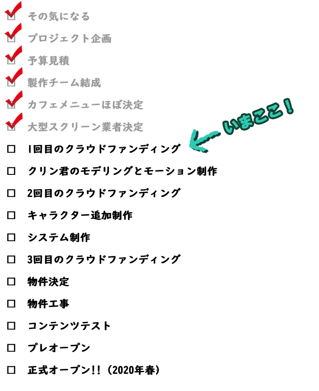 2019/09/19 16:04パトロンの皆さん、こんにちは。すっかり秋が近づいてまいりましたね。とても過ごしやすくて穏やかな気持ちになります♪気温の変化が激しいので風邪にはお気を付けください。さて、LITTLE SQUARE計画は皆さんのおかげで大きな進歩がありました。カフェにやってくる異世界住民第1号「クリン君」が立体(3D)になりましたYO!↓人間に近づいているクリン君↓外注会社になんとか支払いをすることができました♪ (生々しい…)クリンを立体にしてくださって感謝! 益々愛着がわきます。チームの中ではクリン君の動きを作る工程に入っています。 とってもかわいいんですよ♪そして来年春オープンに向けての現在の進捗はこんな感じ。新しい異世界住民の制作にも取り掛かりました。プログラムも必要!ここは自分のコツコツためてきた貯金で、、、そろそろ尽きそうなので大きな支払いは後ろに後ろに回しつつ でも着実に進んでおります!本文で載せていたスケジュールで物件決定と次のクラウドファンディングの順番は入れ替えました。物件を決定して、次回のクラウドファンディングではちゃんと場所をお伝えしたいためです。今回いただいた貴重なご意見の中に「行きたいけど場所がどこか不明なので行けるかわからない」「何が食べれるの?メニューが知りたい」などなど、愛情たっぷりのご指摘をいただきました!次回こそは載せますよー☆来年の頭ぐらいに、もう一の今回以上に素敵なリターンを用意しクラウドファンディングに挑戦したいと思っておりますのでその時も気が向いたら是非応援のほどよろしくお願いします!!PS.今回のリターンに関しては1件ずつ対応中です。 10月以降に届くパトロンの方も 是非楽しみにお待ちください^^ もっと見る今日で最終日!今日は誕生日?!