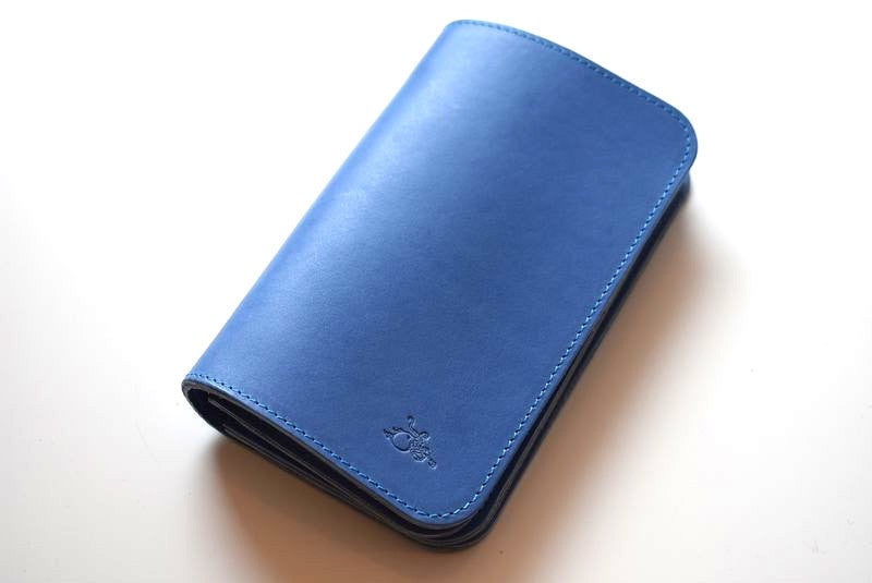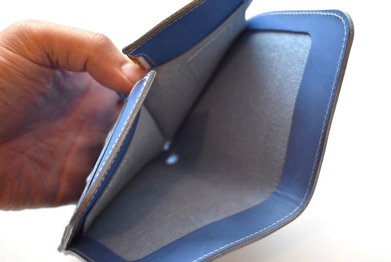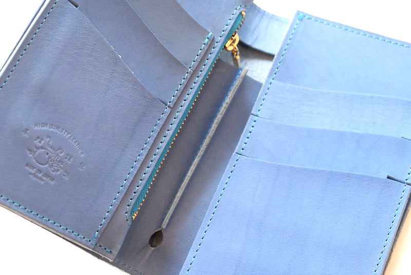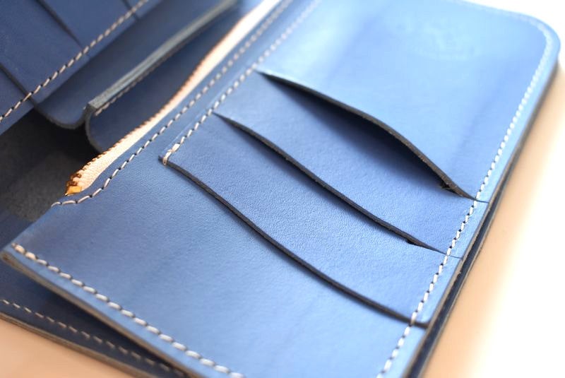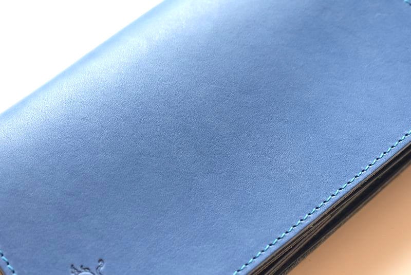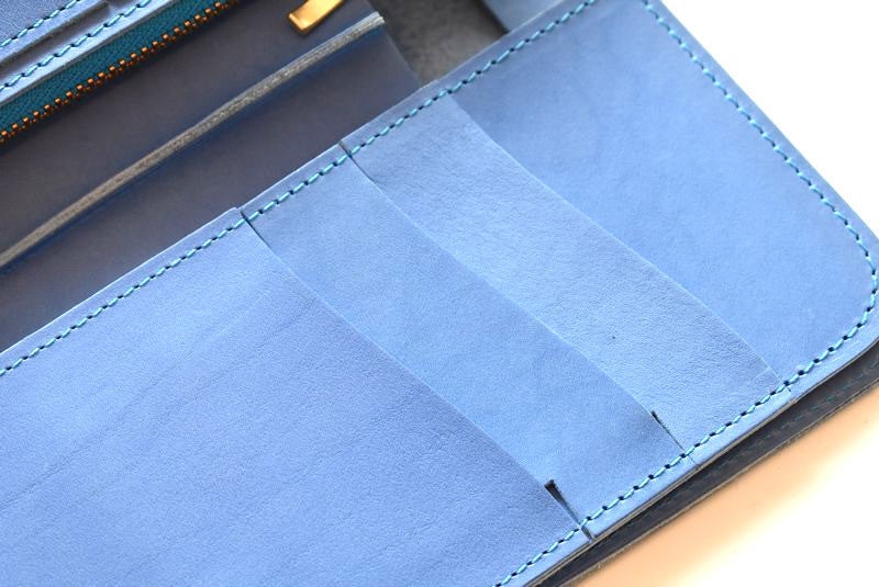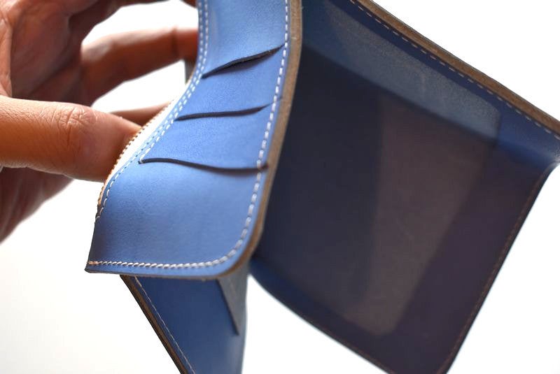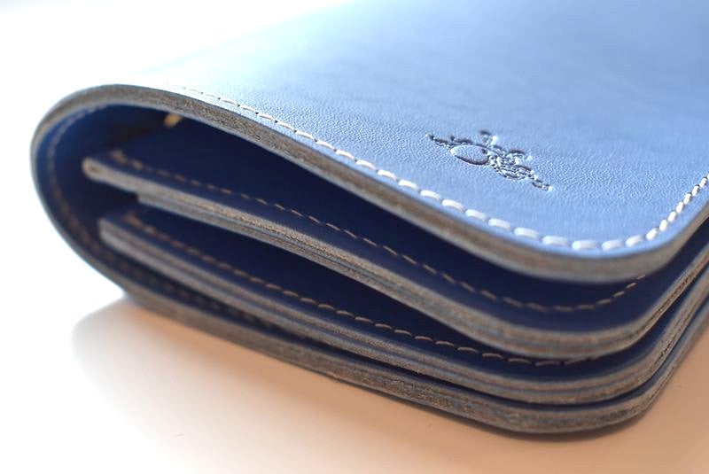 イタリア製の透き通るようなブルーの革を、熟練職人の手により、あえてミディアムウェイトに仕立てた、繊細で上品なミドルワレット。他の革財布では味わえない、一目惚れするような美しさです。