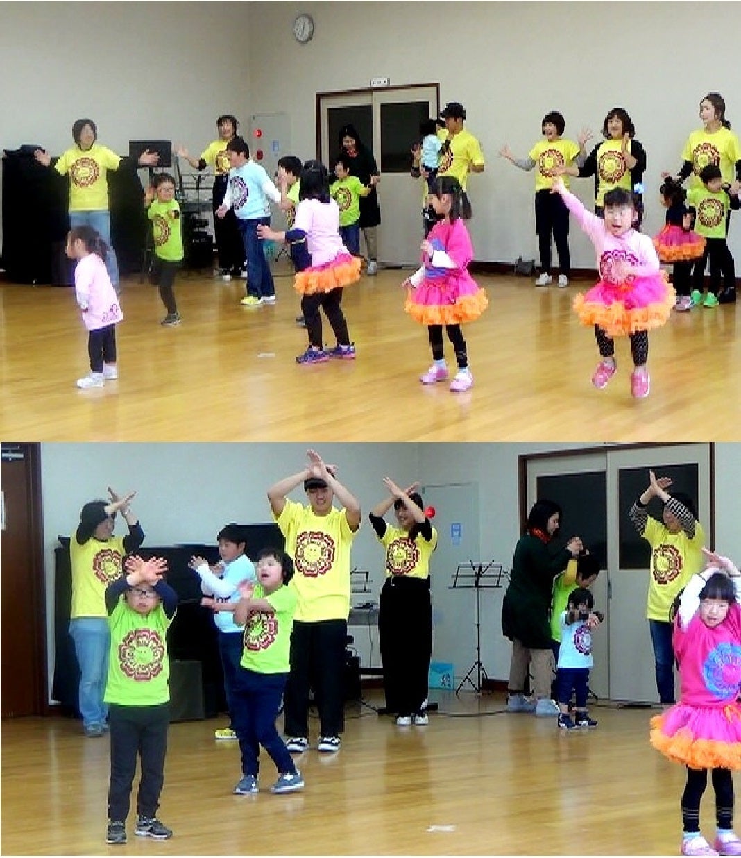 この写真は、障がいを持つ子どもたちが、音楽に合わせて楽しく踊っている場面です。