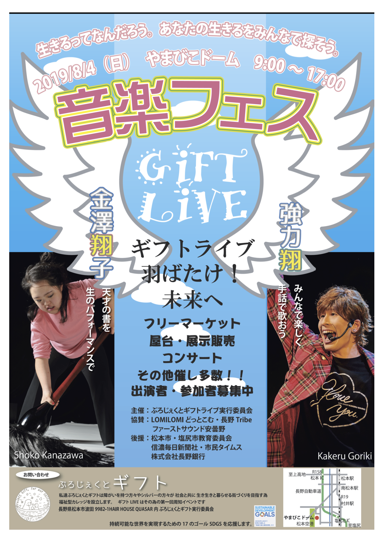 今回の音楽フェスにはダウン症書道家の⾦澤翔子(かなざわ しょうこ)さんと、サインシンガーの強⼒翔(ごうりきかける)さんが本イベントの趣旨にご賛同いただき、ゲストとしてご出演くださいます。