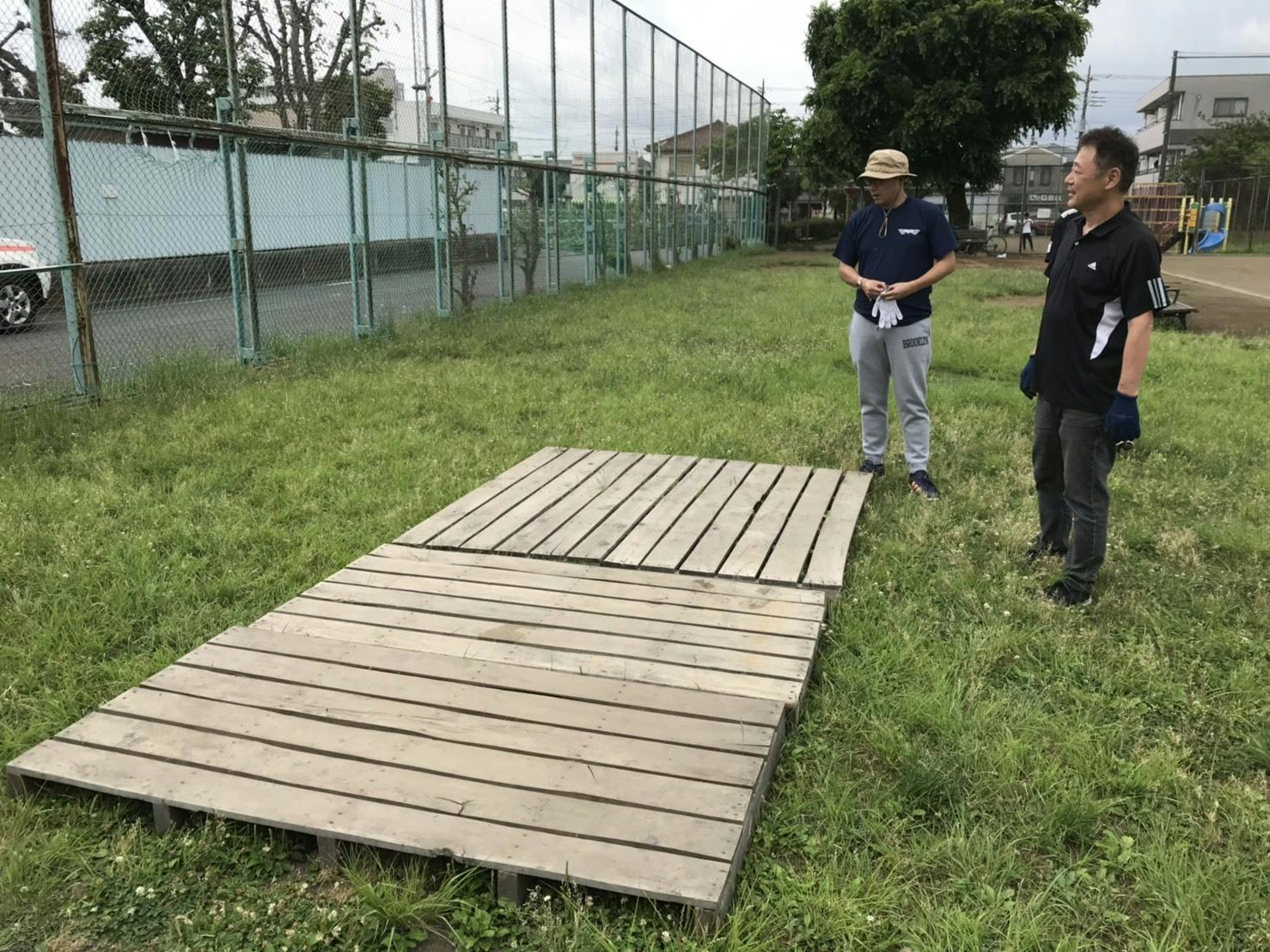 スノコ4枚だけ持っていって敷いてみました。地面はそれほど凹凸もなく、比較的安定して置けるので、これを20枚敷き、コンパネを貼ってステージを設置しようと思います。