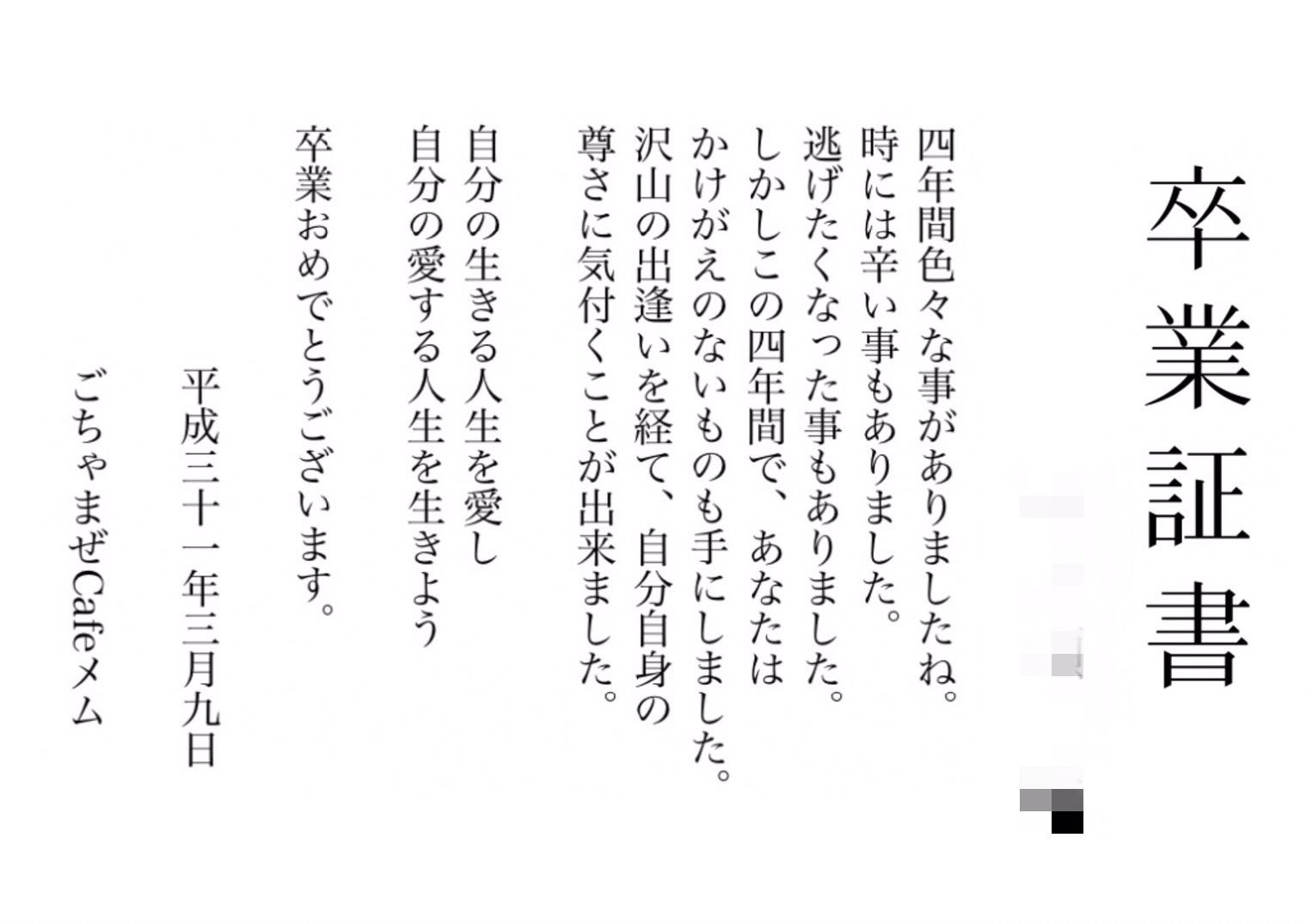 ご本人は、実際に参加するかどうか迷いがあったそうですが、「来て本当に良かった」と言ってくださいました。“卒業証書授与”では、涙を見せる一幕も。メムの店内は、あたたかい空気に包まれていました。