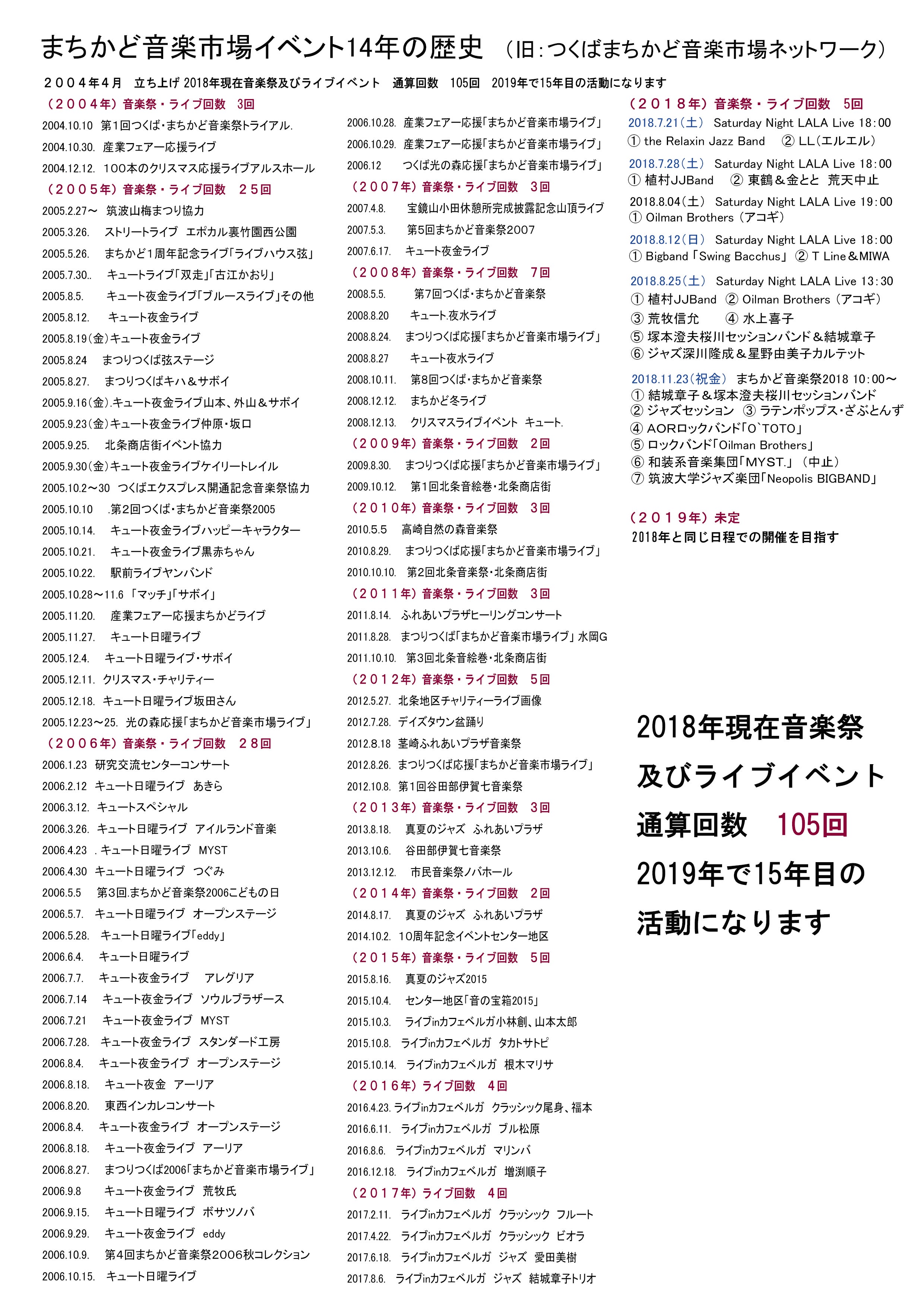 つくば市は子供が関係する音楽関係の教育プログラムなど行政、市民レベルで充実し、文化芸術など行政レベルで国際的な「つくば国際音楽祭」など開催されていますが、残念ながら資金が無い市民が開催する音楽主体の音楽フェス、音楽祭などは主役の座には付けません。食、祭りなどのイベントの片隅で音楽ステージ(付録的)などが開催されている現状です。その現実を打ち破りたいと2004年~2018年までのライブイベント回数は通算105回開催。2019年で15年市民ボランティアで孤軍奮闘していますが、なかなか市民に認知されず観客も少ない現状が続いています。なので大きな波にはなれない現実。演奏家(プロ、アマチュア)が気持ちよく参加できる音楽ステージを実現して、人の営み、地域の活性に重要なエッセンスになりうる音楽文化圏創出を実現したいと活動しています。強いこだわりとして親などの観客が殺到する子供(金管。吹奏楽など)は出演させない大人の音楽祭です。