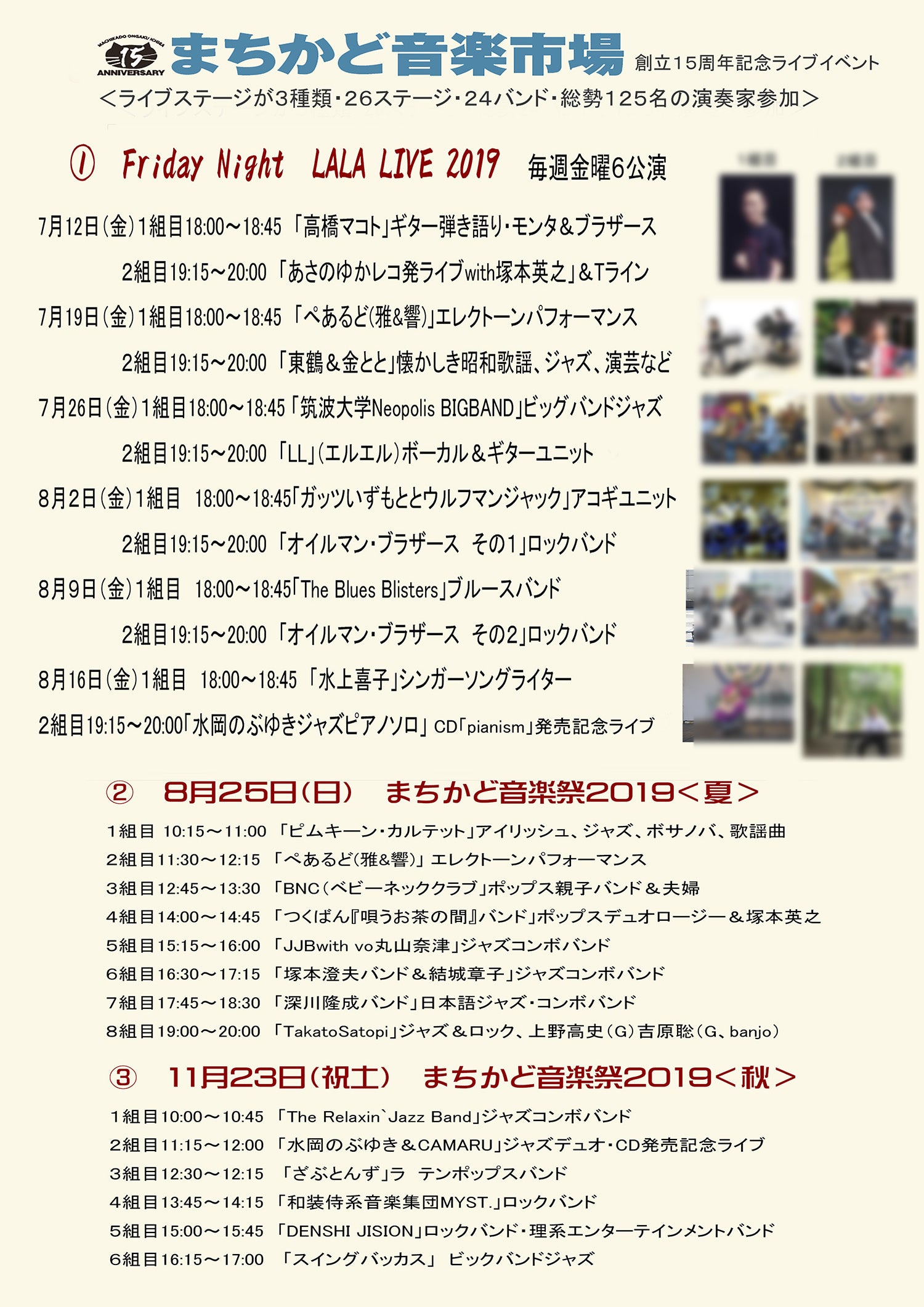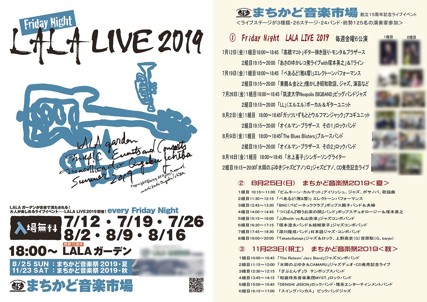 民間施設の「LALAガーデンつくば」はまちかど音楽市場のテーマをご理解頂き、1人で開催する音楽祭実現するご協力いただいております。(資金提供はありません)チラシの画像は15周年で開催する3種類記念ライブ前半の「Friday Night LALA LIVE 2019」です。