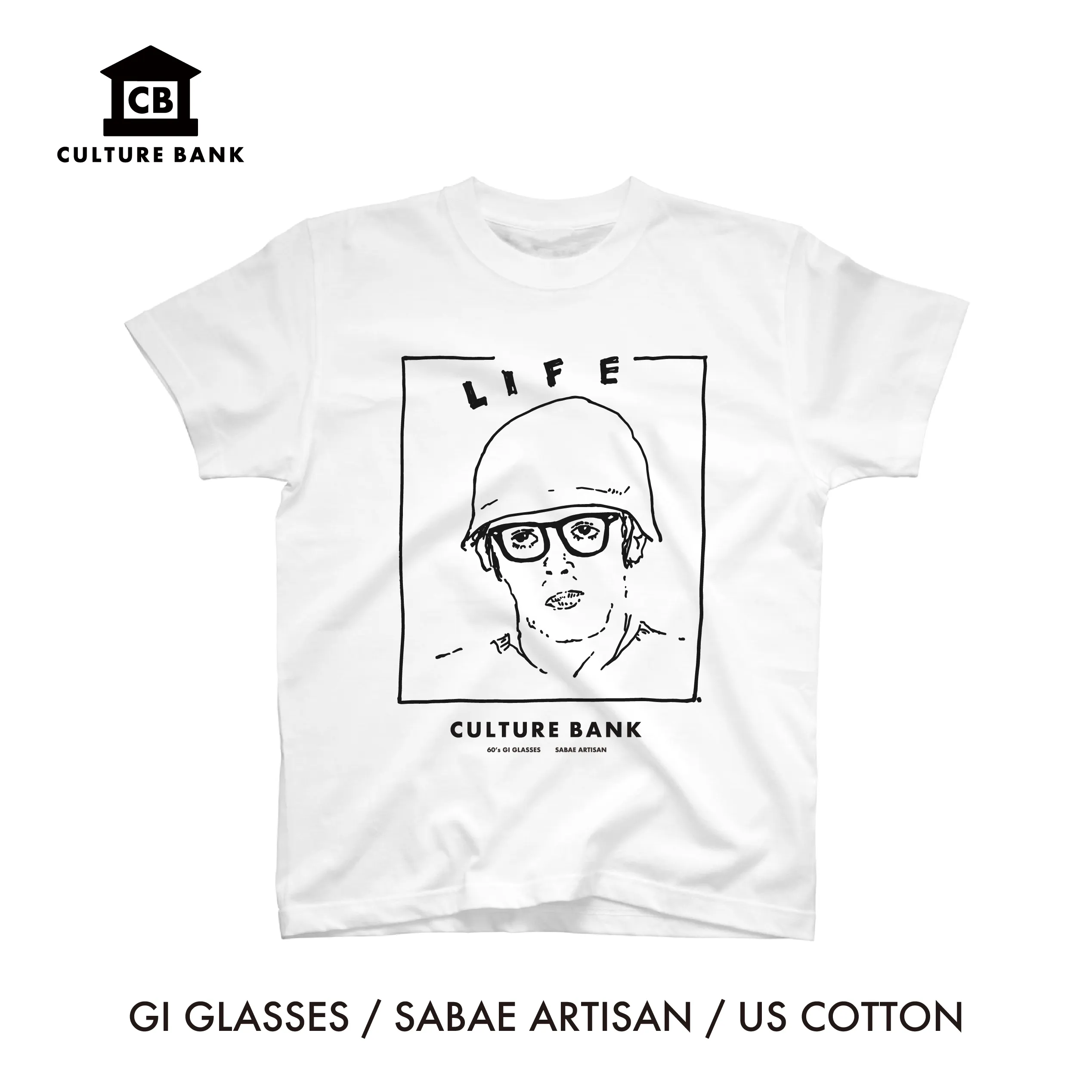 米綿(アメリカンコットン)を空気の圧力で紡績した編み糸を使用。風合いよく仕上がっています。胸にはミリタリーのイラストと60's GI GLASSES x SABAE ARTISANの文字がプリントされる。