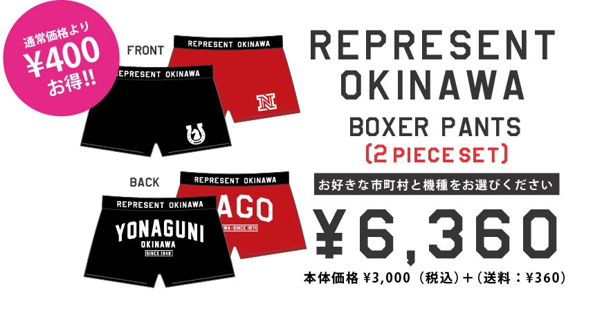 REPRESENT OKINAWA BOXER PANTSをご指定のデザイン(番号でご指定ください)で2枚お届けいたします。