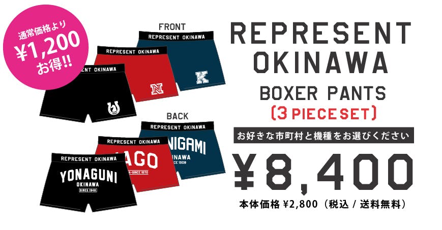 REPRESENT OKINAWA BOXER PANTSをご指定のデザイン(番号でご指定ください)で3枚お届けいたします。