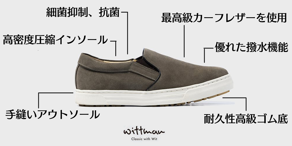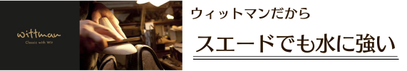 『Wittman オーダーメイド本革防水スエードスリッポン』は、ドイツ製のスエード素材の品格に撥水(はっすい)機能を加え、ベーシックなデザインながら差別化されたスタイルを提案します。雨が降ると濡れてだめになってしまうスエード靴の従来イメージを覆す、これまでにない製品です。