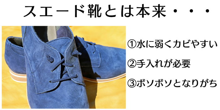 雨が降ると濡れてだめになってしまうスエード靴の従来イメージを覆す、これまでにない製品です。