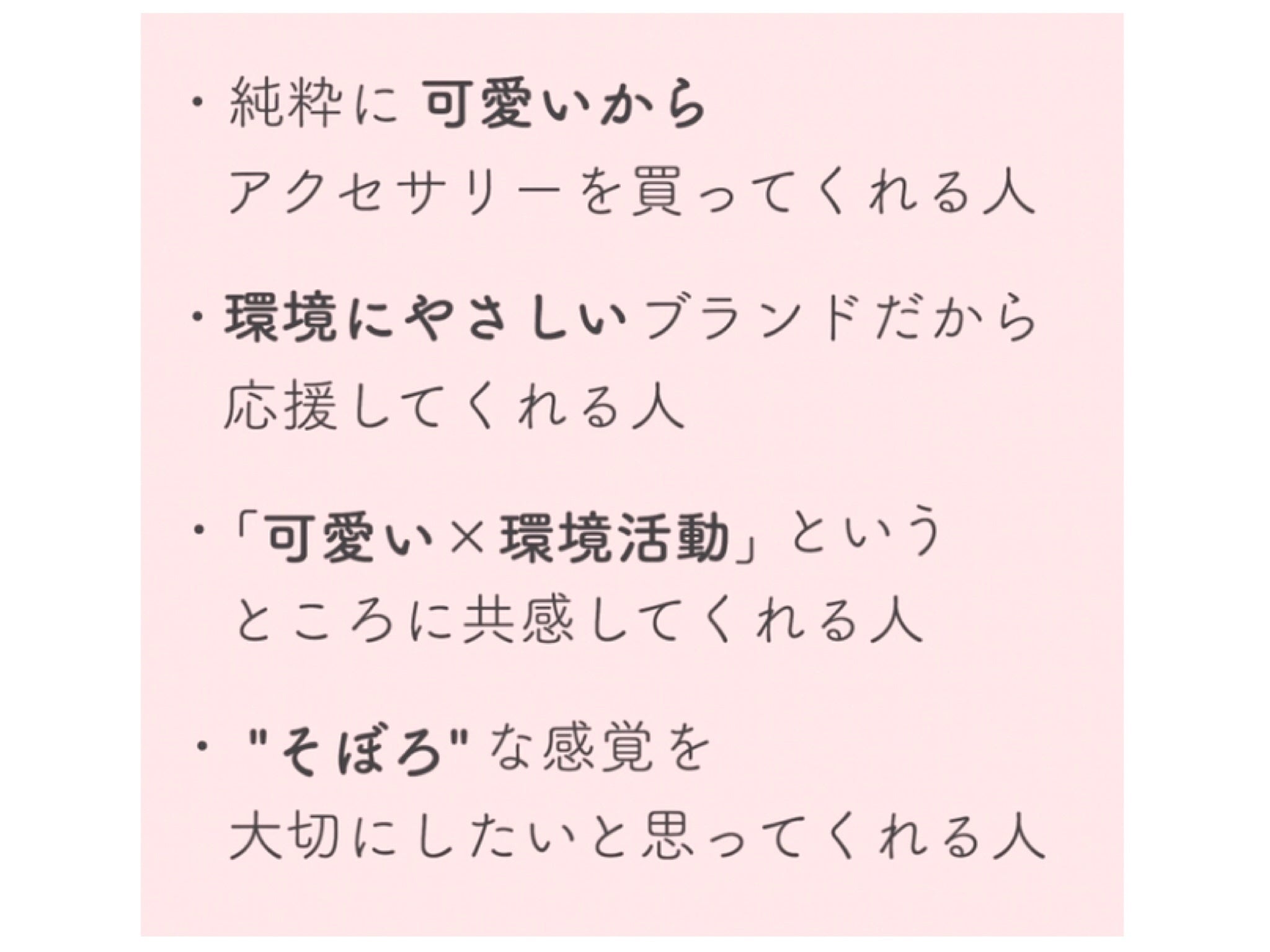 そこで、アクセサリーという、可愛くて楽しい、ポップなアイテムに乗せることで、本当に叶えたいところである " 環境に配慮して生きる人を増やす" ということが、叶えられるのではないかと私は考えました。