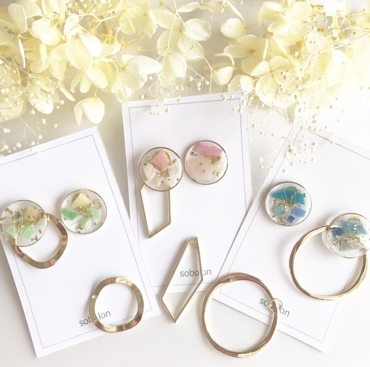 ④作成したレジンパーツと、アクセサリー金具を組み合わせ、ピアスやイヤリング、指輪などのアクセサリーとして完成させます。
