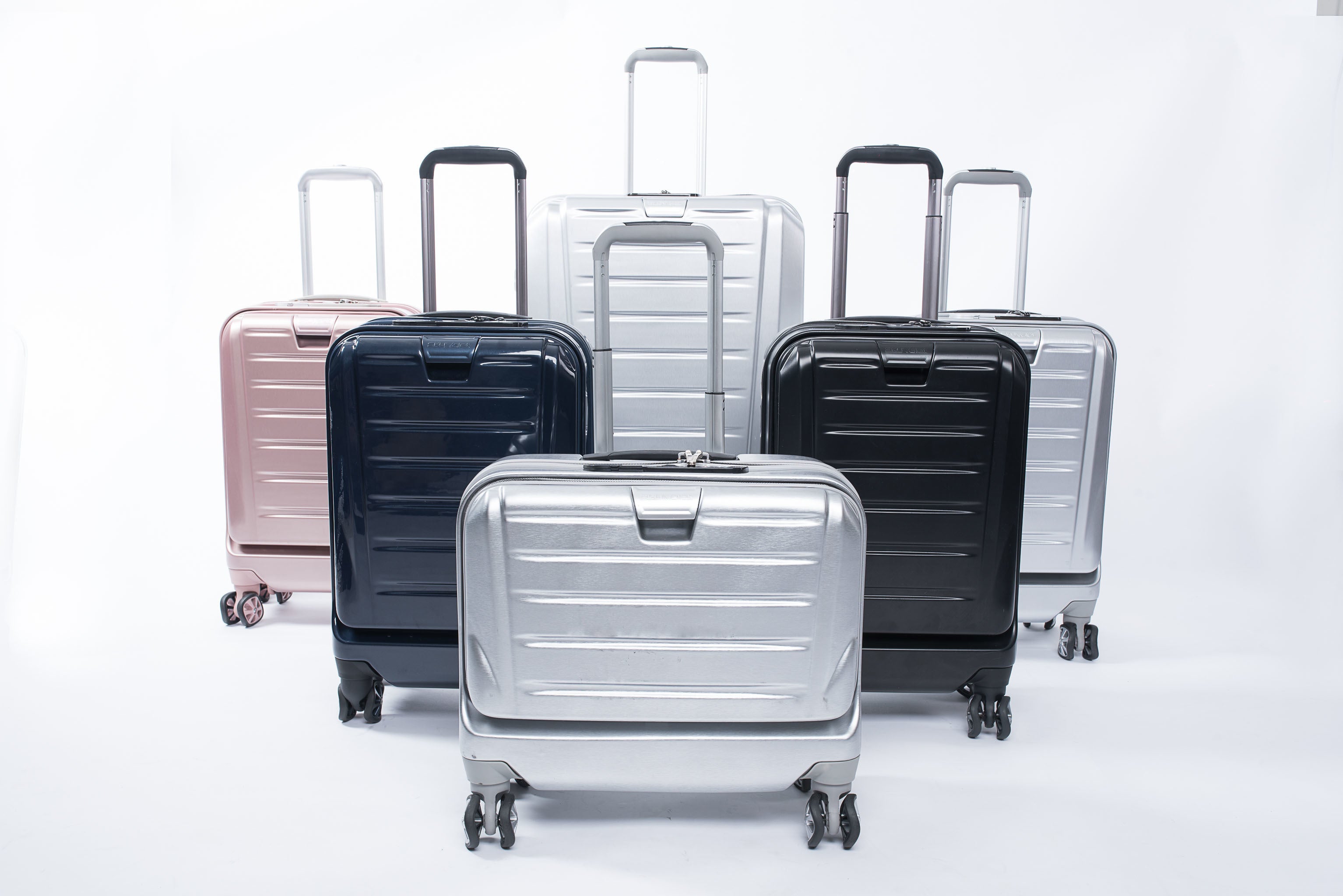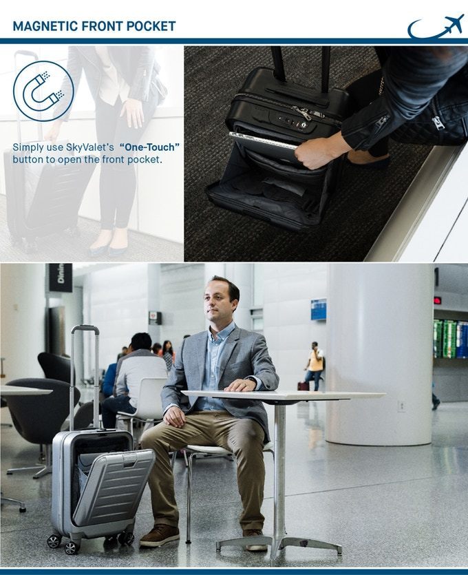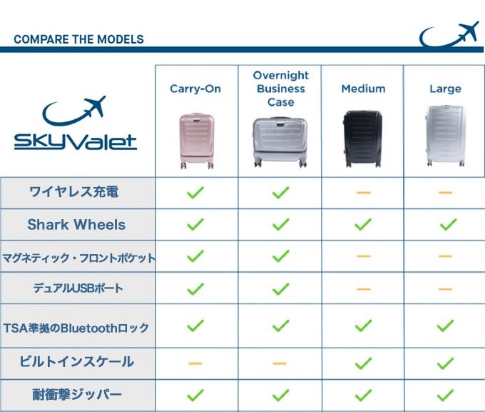 SkyValet(スカイバレット)は、スマホのワイヤレス充電、特殊形状で段差もスムーズに乗り越えられるホイール、簡単アクセスポケットなどを備えた、革新的でTSA準拠のスマートなスーツケースです。