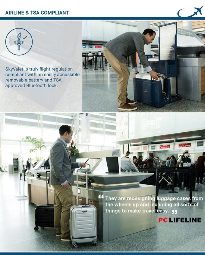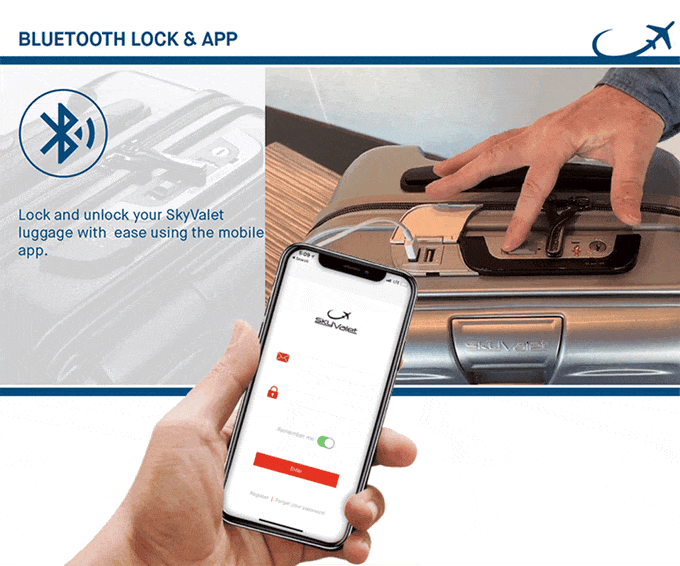 SkyValetの全モデルは、航空規則に完全に準拠します。バッテリーは取り外し可能で、TSA準拠のBluetoothロックを採用しています。