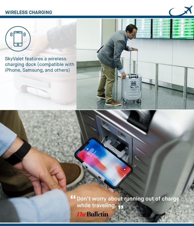 SkyValetのOvernight Business CaseとCarry on Caseは、ワイヤレス充電ドックを搭載しています。iPhone、Samsungスマホなどさまざまなデバイスに対応。