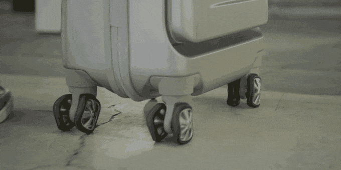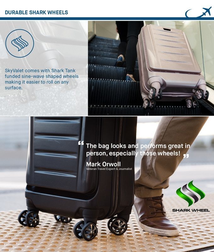 SkyValetの全モデルは、ユニークなサインウェーブ型のキャスター「Shark Wheels」(特許取得済み)を搭載。段差や障害もスムーズに乗り越えていきます。