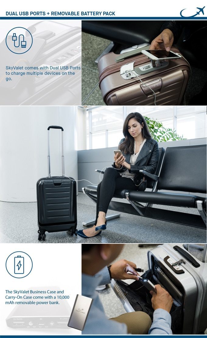 SkyValetのOvernight Business CaseとCarry-On Caseは、デュアルUSBポートを搭載しており、2台のデバイスを同時に充電できます。
