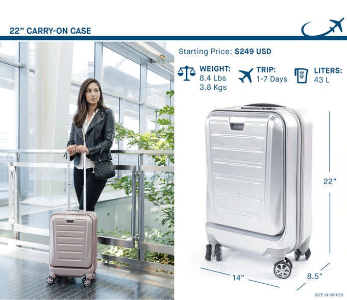Carry-on Caseは、1〜7泊の旅行に最適なスーツケースです。容量は43L。主要航空会社で機内持ち込みが可能。ワンタッチで開閉するマグネティック・フロントポケットを搭載。ワイヤレス充電ドック、ディアルUSBポート、 Shark Wheelsなどが揃った、旅行をスマートで快適にしてくれるスーツケースです。