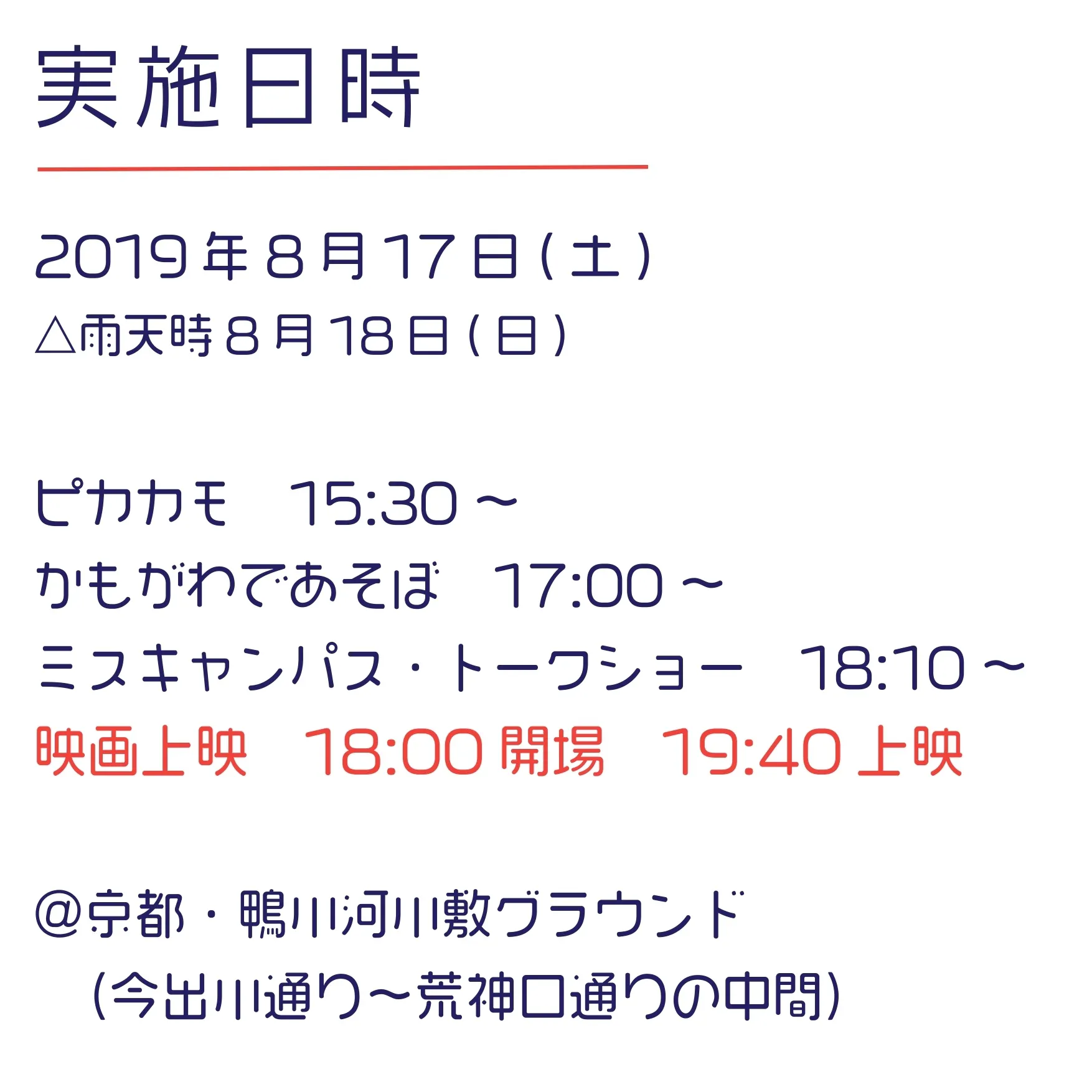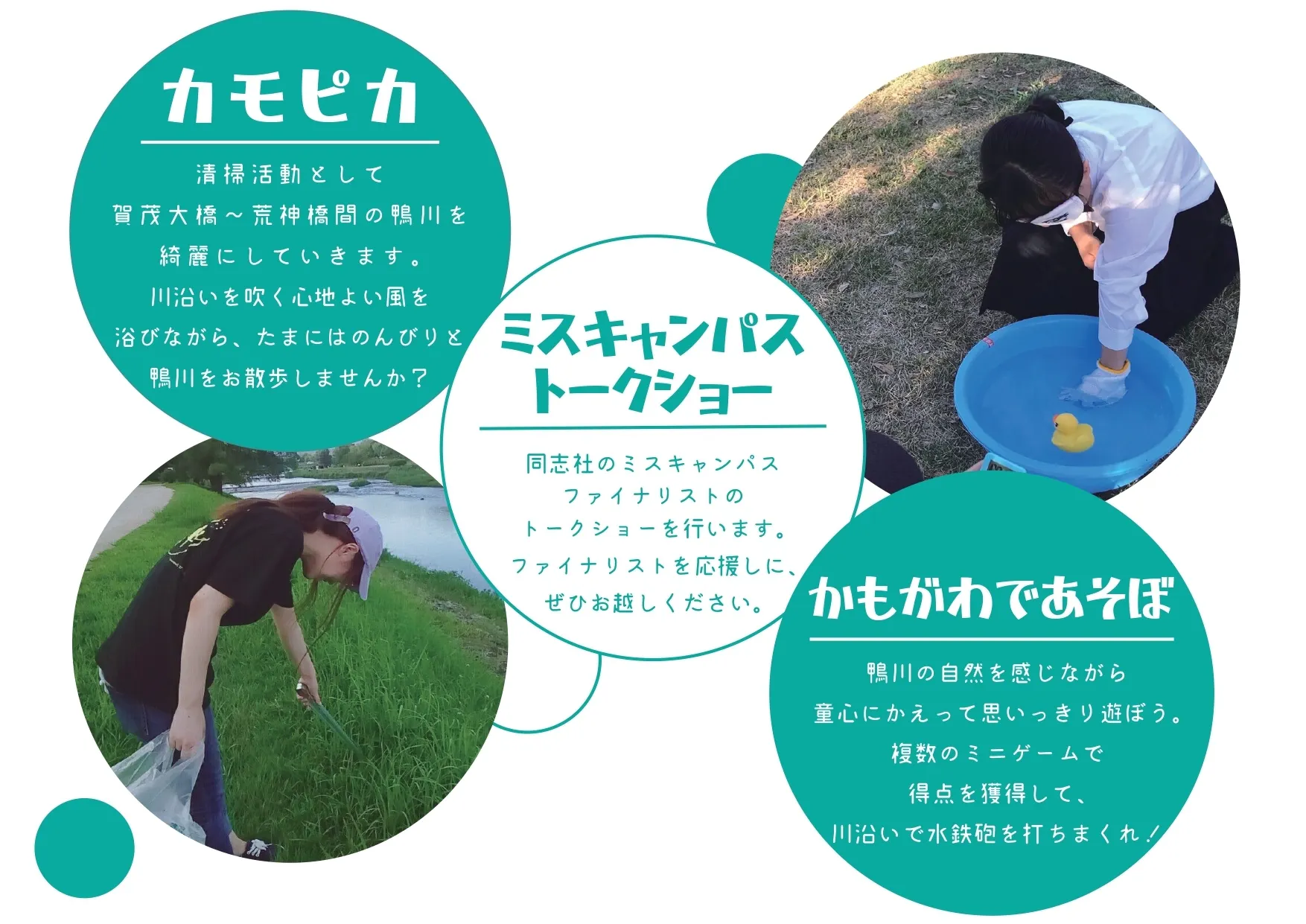 また、映画上映の前には、立命館大学・同志社大学のミスキャンパスによるトークショーや鴨川河川敷で自然を活かしたミニ企画も行いました。他にも、カモシネマの企画・運営の際にお世話になっている「鴨川を美しくする会」という団体が企画する鴨川納涼のお手伝いや、月に一度の鴨川の清掃活動にも参加しています。