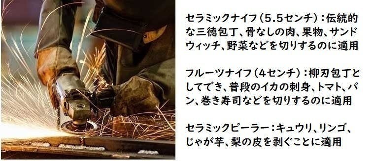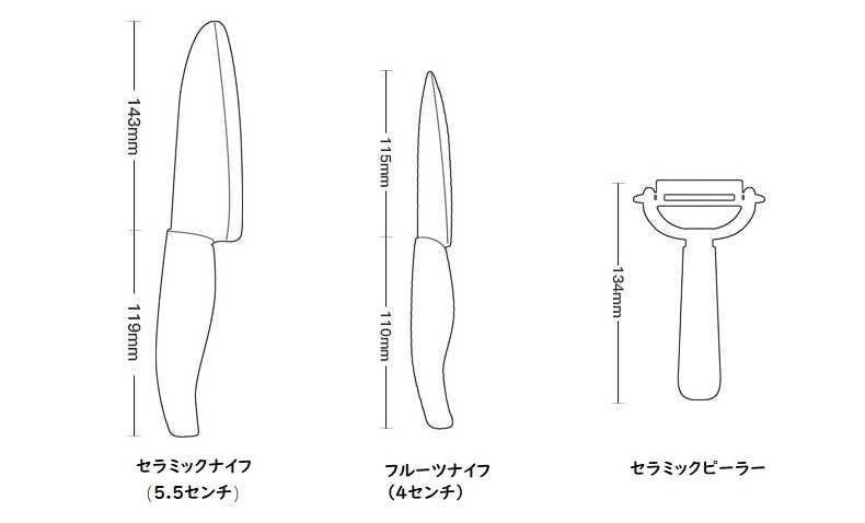 1、梱包の内容(3点セット):セラミックナイフ(5.5センチ)、フルーツナイフ(4センチ)、セラミックピーラー