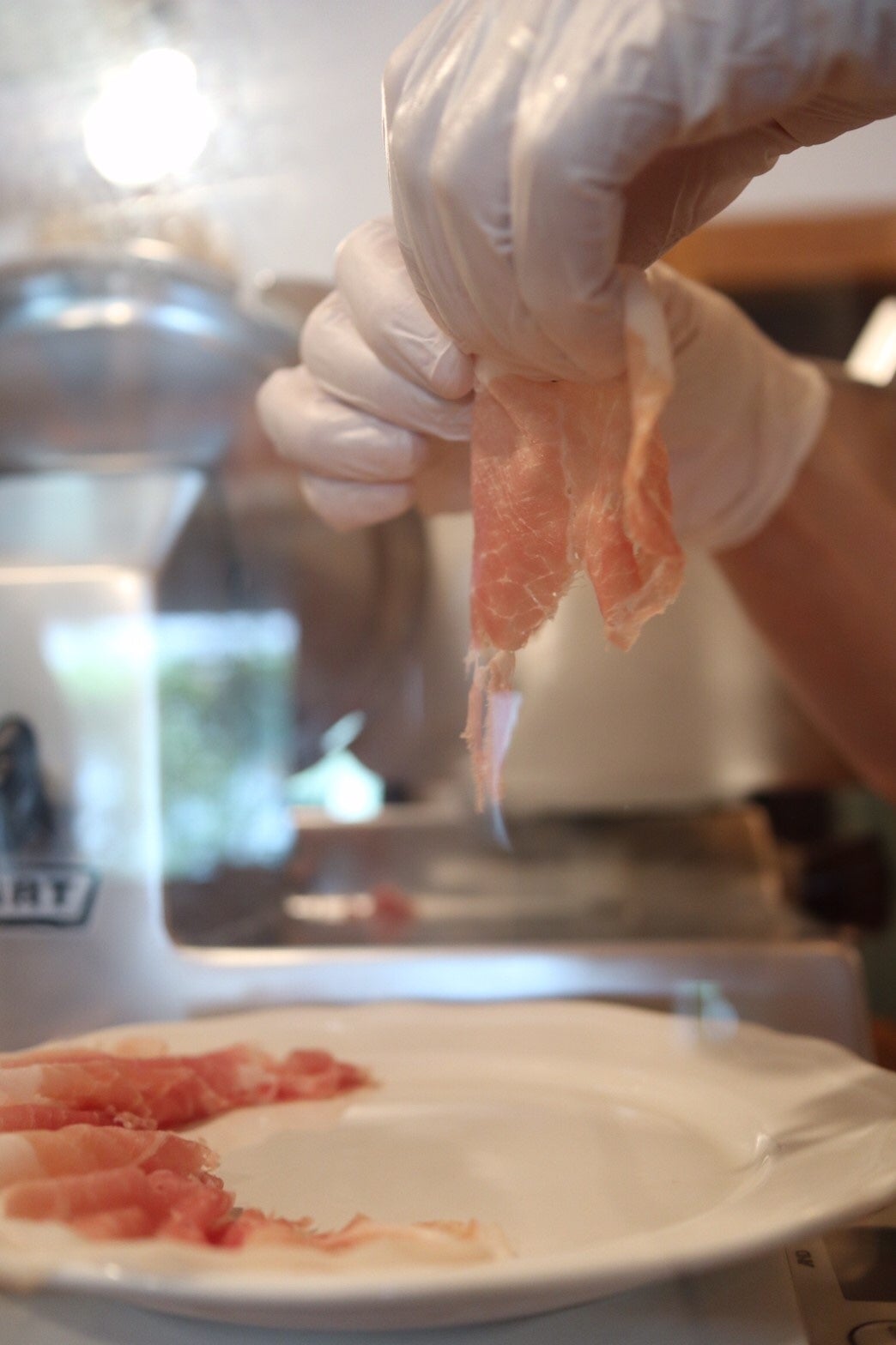 当店はナイフは使わずに【サルメリア69】店主 新町賀信氏を師事しスライサーを使い、できるだけ薄くスライスし提供します。