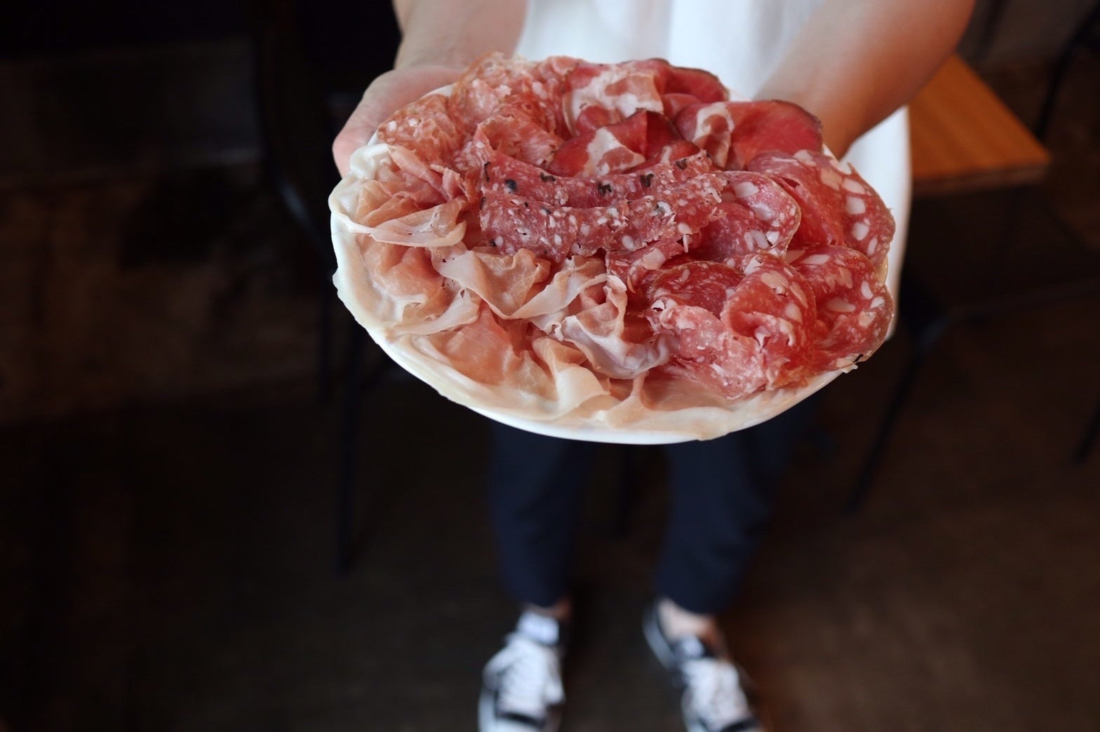 現在は切りたて&薄切りのパルマ産 生ハムやサラミなどを中心としたフードメニュー。