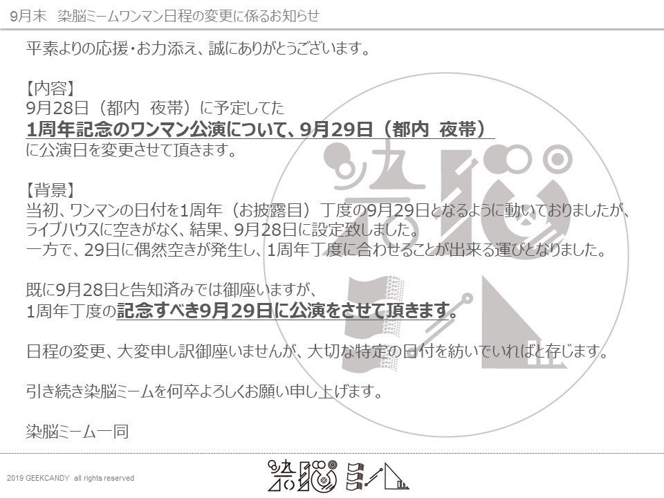 9月末 染脳ミームワンマン日程の変更に係るお知らせ