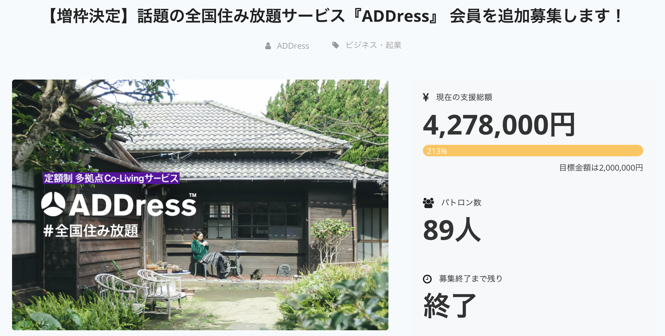 ADDressの企画するCAMPFIREでのプロジェクトは今回で2回目。
