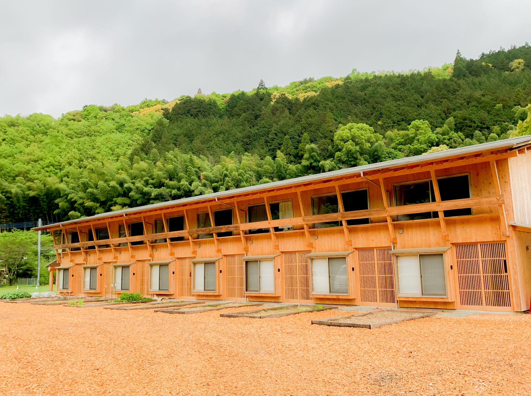 福岡の山どころとも呼ばれる八女市でローカルな長屋ぐらしができる拠点です。八女市街地から30分ほど車を走らせるとたどりつく風光明媚な里山エリアに位置し、清流の音や鳥のさえずりをBGMにゆったりとした贅沢な時間を感じられます。八女杉などを使った建物も特徴的です。