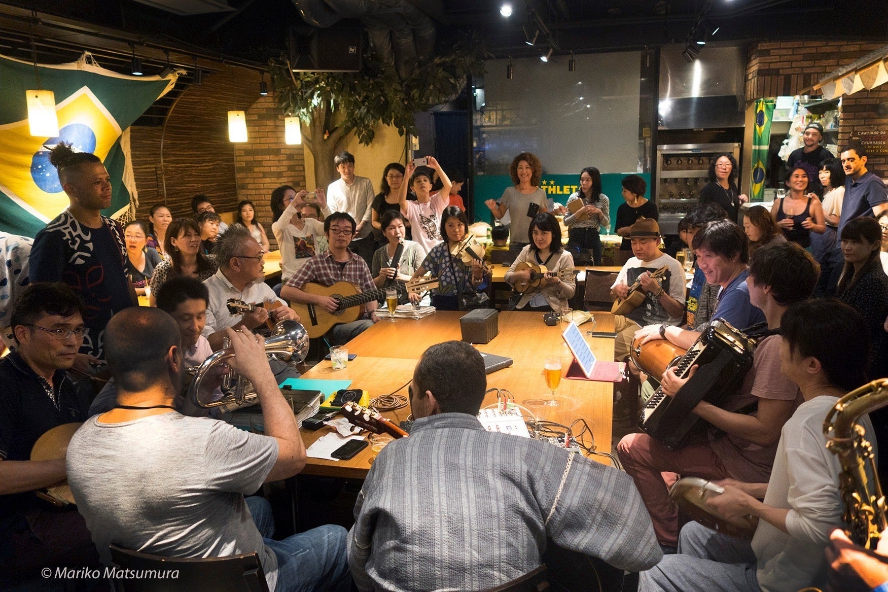 そして7/12(金)”街角にショーロを”をコンセプトにシルヴェリオがリオで進めているショーロ・プロジェクト、Choro na Ruaが東京初、日本初上陸、浅草キボンにてChoro na Rua em Tokyo。プロアマが集まり総勢65名のショーロ大セッション。この企画は来日決定以前より夢見ていたもの。Viva o Choro! シルヴェリオがファンのために持ってきたChoro na RuaオリジナルTシャツ20枚は即完売。あ、シャーレスの甚平姿、似合ってましたね。