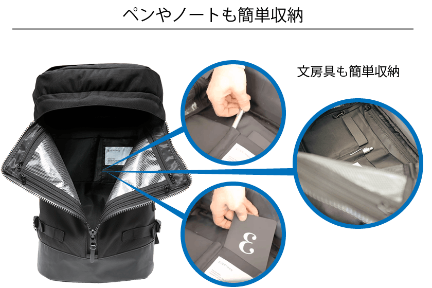 A.本体の素材は防水です。ジッパーは防水ではありませんが、ジッパーの位置が側面にあるため雨の日でも背負う事が可能です。