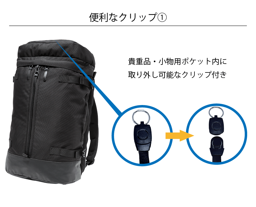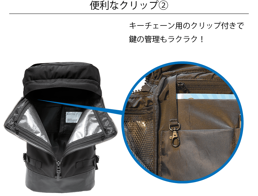 貴重品・小物用ポケットの内側に着脱可能なクリップがあります。