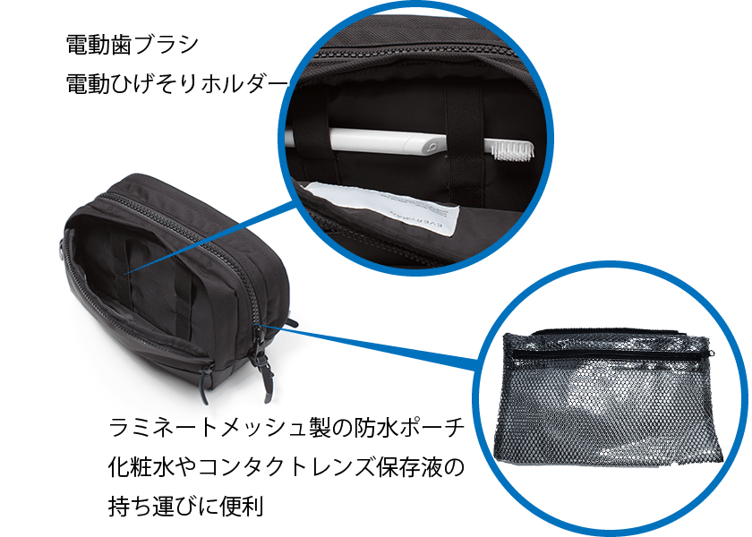 ラミネートメッシュ製のサイドポケットは傷やほこりから荷物を保護します。